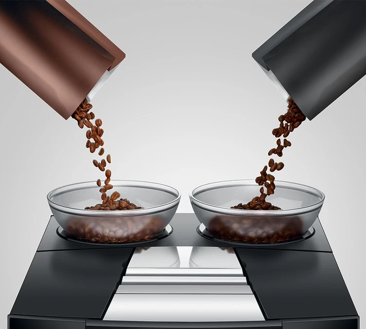 Cet expresso broyeur Jura Giga 10 est équipé de deux bacs à grain ainsi qu’une trappe à moulu pouvant accueillir 2 doses. De quoi varier avec 3 cafés différents au quotidien ! Les bacs à grains sont reliés à 2 broyeurs indépendants. Jura apporte une vraie innovation en vous proposant de choisir directement quel pourcentage de chaque bac vous souhaitez utiliser pour réaliser votre boisson. Vous avez bien compris, vous pourrez donc mélanger le contenu des deux bacs, dans les proportions de votre choix. Vous pouvez bien entendu également faire le choix d’utiliser uniquement un seul des deux.